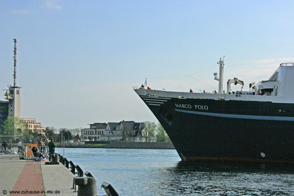 Der Bug des Kreuzfahrtschiffs Marco Polo vor der Pier 7